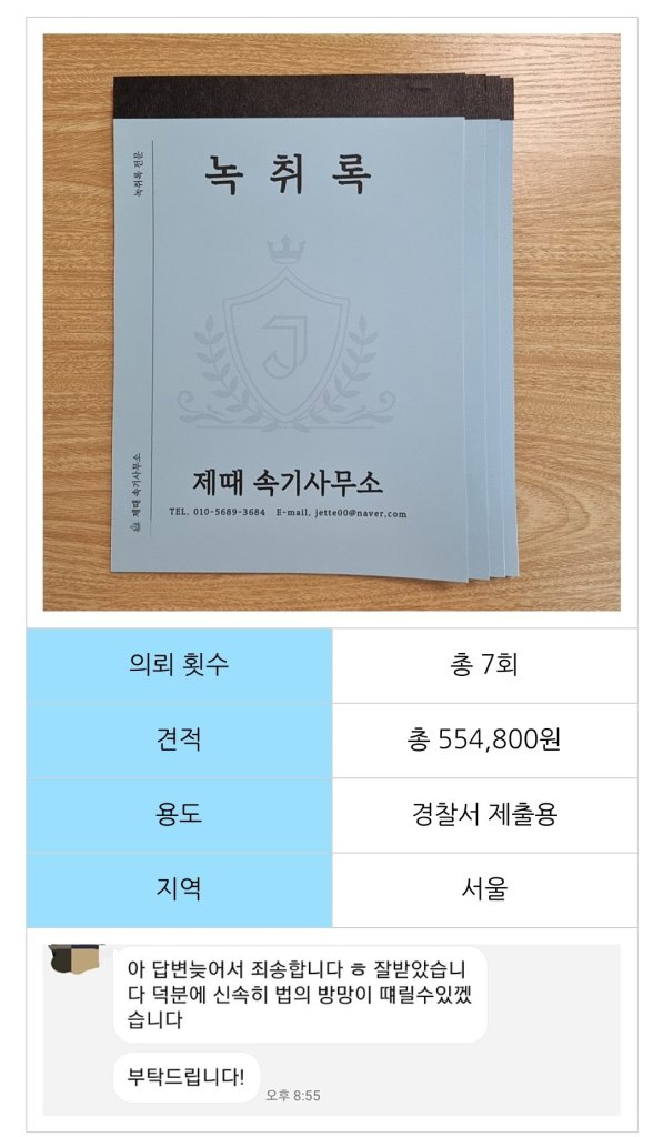 이상, 제때 속기사무소 의뢰인의 경찰서 제출용 녹취록 후기였습니다.